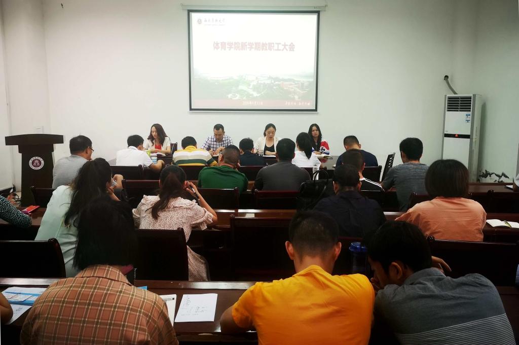 9月11日上午9点,体育学院新学期教职工大会暨统战工作通报会在学院会议室召开,党总支书记邹小萍主持会议。