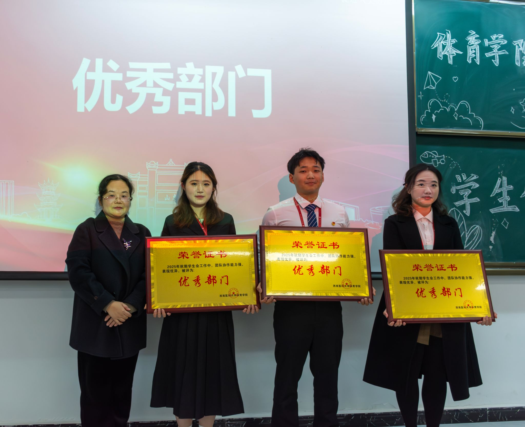 参会嘉宾对各部门的述职报告进行了现场评分并颁奖,大会最后表彰了秋季学期表现突出的集体与个人。易班工作部、组织部、志愿者部荣获优秀部门称号;陈兴豪、王莹莹、任佳欣获评优秀部长;严肃、贾严钧、张文洋获评优秀副部长