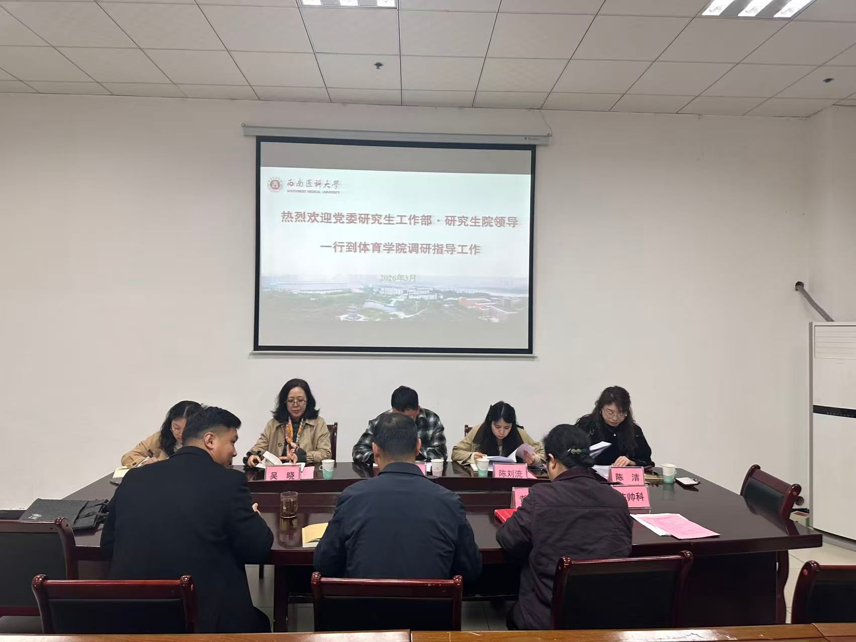 为进一步加强与二级学院在研究生教育管理方面的沟通协作,2026年3月23日下午,党委研究生工作部·研究生院一行赴体育学院开展走访调研座谈会。会议在体育学院会议室举行,研究生院副院长毛亮、吴晓,副部长陈刘流、学科建设与学位办主任陈洁、科员张琪琪老师莅临指导,体育学院院长王定宣、党委副书记黄莉、副院长刘中强及学科建设与研究生管理科辅导员陈帅科参加了走访调研座谈会,会议由体育学院副院长刘中强主持。