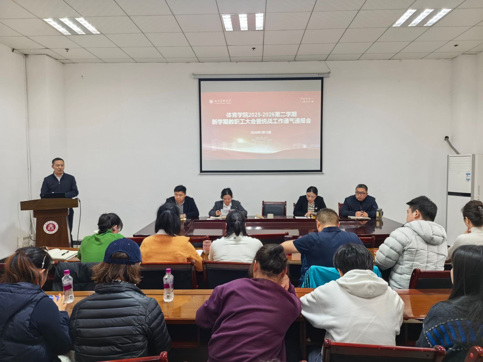 3月12日下午,体育学院在学院会议室召开2025-2026第二学期新学期教职工大会暨统战工作通气通报会,学院全体教职工、统战人士参加了会议。会议由党委书记邹小萍主持。