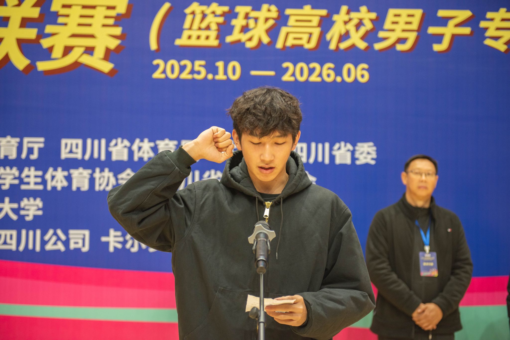2025年11月29日上午,四川省第六届“贡嘎杯”青少年校园体育超级联赛篮球高校男子专业组比赛开幕式在西南医科大学青年体育中心篮球馆隆重举行。本次赛事由四川省教育厅、四川省体育局、共青团四川省委主办,四川省大学生体育协会、四川省篮球协会执行,西南医科大学承办。西南医科大学党委常委、副校长周翔宇,四川省体育局青少处干部王森,四川省大学生体育协会副会长张萍,西南医科大学体育学院党委书记邹小萍,赛事纪律监督陈小剑,比赛监督蒲实、向瑜、佘涛、黄国园,技术代表熊卫权、江旗林、张辉勇,比赛裁判长王晨曦,以及全体裁判员、领队、教练员、运动员出席和参加开幕式。开幕式由西南医科大学体育学院院长王定宣主持。