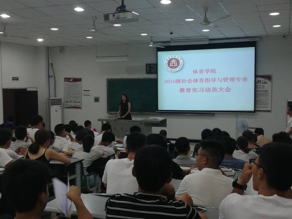 体育学院于2018年9月5日晚18:30在海川楼413教室举行2015级实习生动员大会。体育学院党总支副书记何红媛、副院长王晓芳、学生科科长葛李、科教科辜山老师、学生科辅导员刘权和全体2015级实习学生参加此次大会。会议由科教科辜山主持。