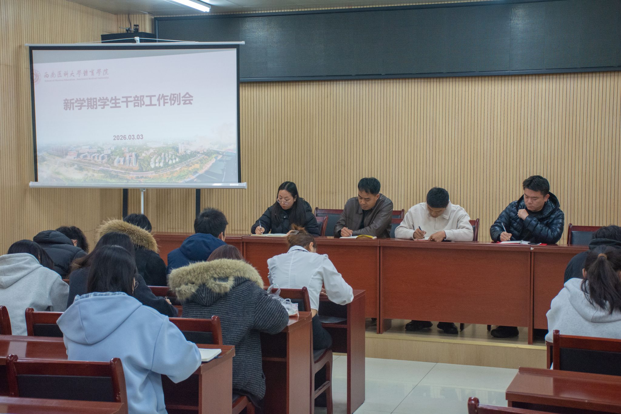 为进一步凝聚学生骨干力量,明确工作方向,推动新学期各项工作稳步开局,3月3日,体育学院在青体馆会议室召开新学期学生干部工作例会。学生科科长李斌、辅导员杨星月、李浩以及分团委学生会主要学生干部参加会议。会议由学院分团委书记刘泸主持。